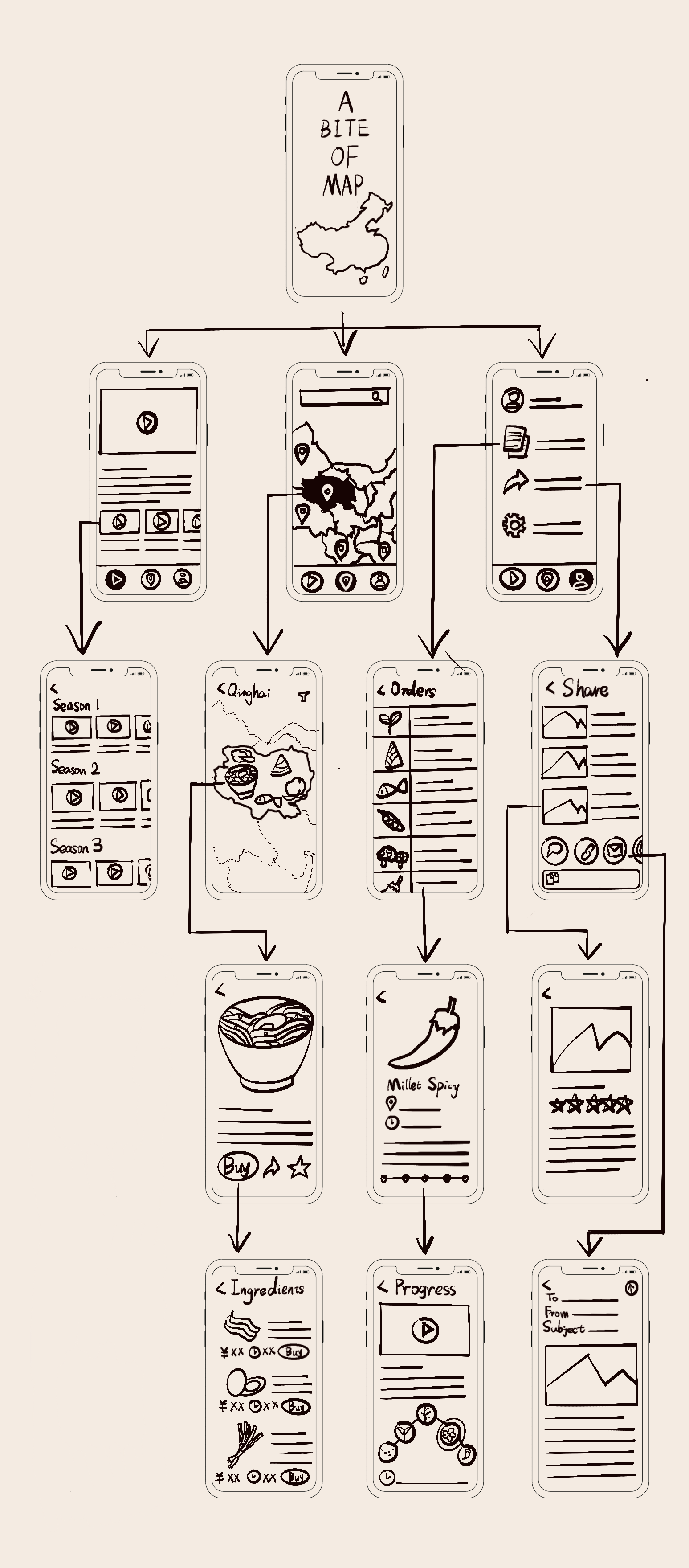 A Bite of Map is a collection of maps of all the food in the documentary A Bite of China. In the past, audiences were curious about the food while watching the documentary, but they didn’t have enough information to access them. Now, they can establish a interaction with the documentary through this app.