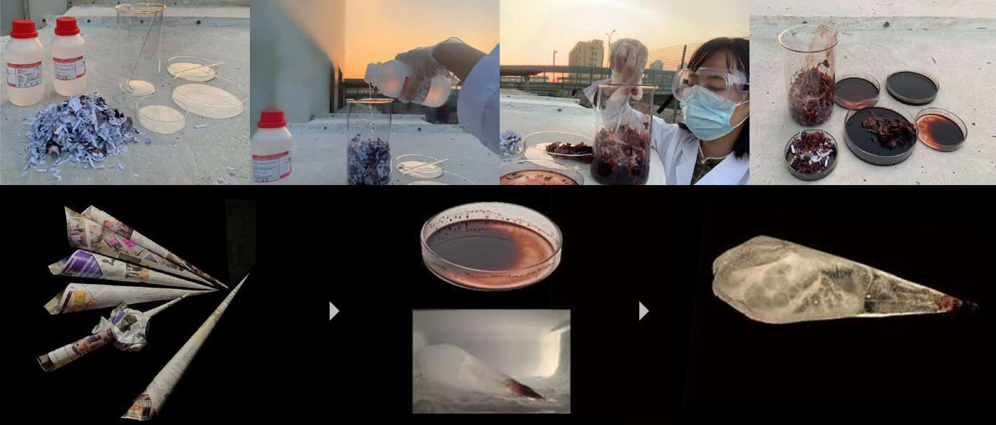 This performance art piece is an attempt to reflect on the grief that COVID-19 has brought to people around the world and to question the endurance of public memory. I collected and photographed news related to COVID-19, then extracted the toxic substance Sym-Diphenylcarbazide (C₁₃H₁₄N₄O) from this content and sealed it into an ice arrow. Through the extreme act of using this toxic ice arrow on the human body, I aim to ask whether certain forms of oppression preserve memory forever.